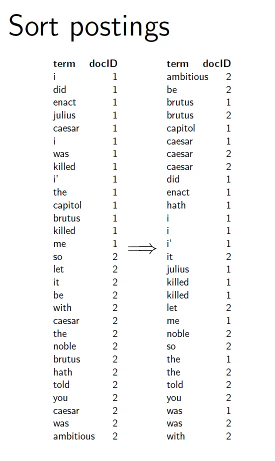 2. 단어를 중심으로 postings를 sorting 하고 하나의 list로 합친다.