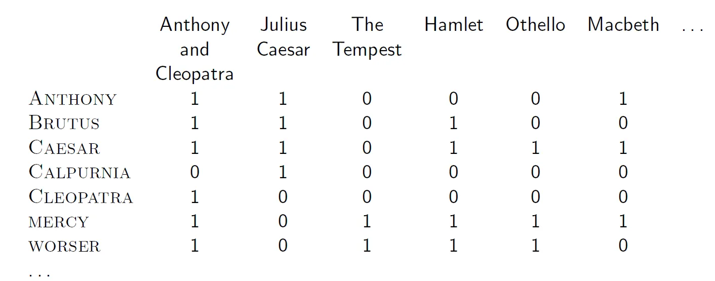 위의 표를 term document incidence matrix라 한다. Term이 왼쪽에 있고 위쪽에 document가 있는 matrix이다! Term document incidence matrix라 하면 바로 위의 그림을 떠올릴 수 있도록 익혀두자!