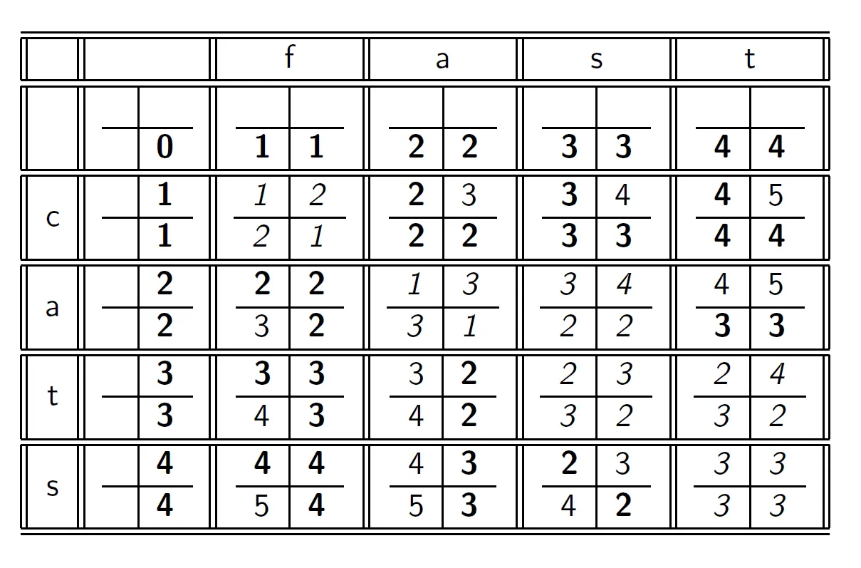 실제 계산을 한 번 해보자. cats, fast의 경우 최적의 minimum edit distance를 구하기는 쉽지 않다. 알고리즘은 다음과 같다.