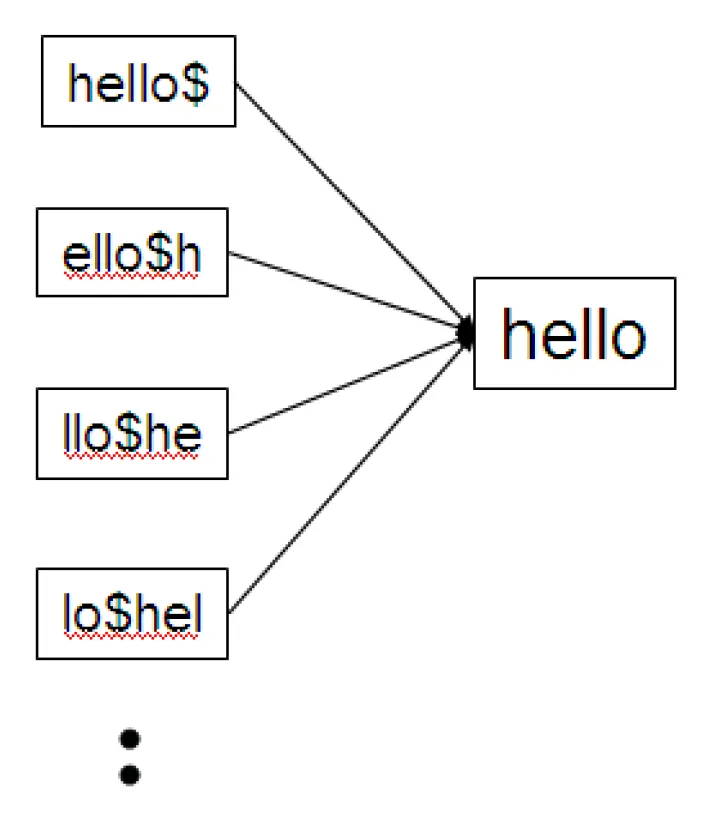 permutation을 구하면 단어의 끝 철자를 구별할 수 없으므로 $를 붙여줘야 한다. 그럼 hello$, ello$h, llo$he, lo$hel, o$hell, and $hello 이렇게 6개의 permutation을 구할 수 있고 이를 permuterm이라 한다.