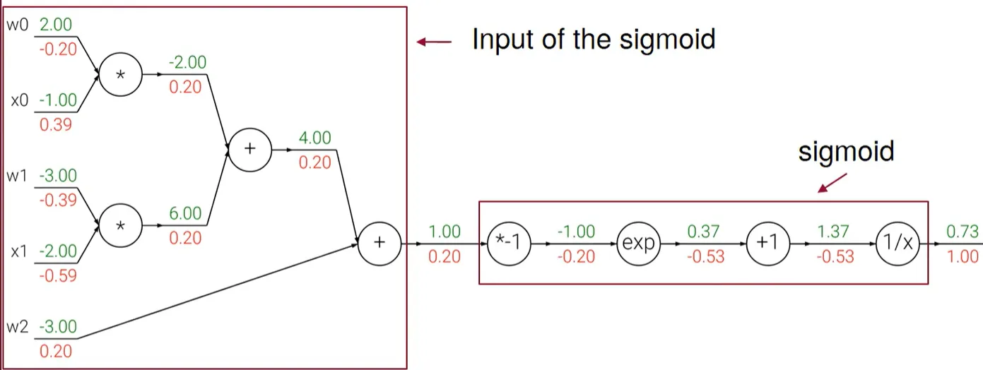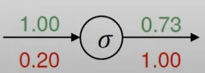 굉장히 간단해지는 것이다. local gradient를 x에 대해 계산하는 것이 아니고 $\sigma (x)$ 라는 것만 주의하자. 그래서 0.73을 쓰고 풀이가 다음과 같이 되는 것이다.
