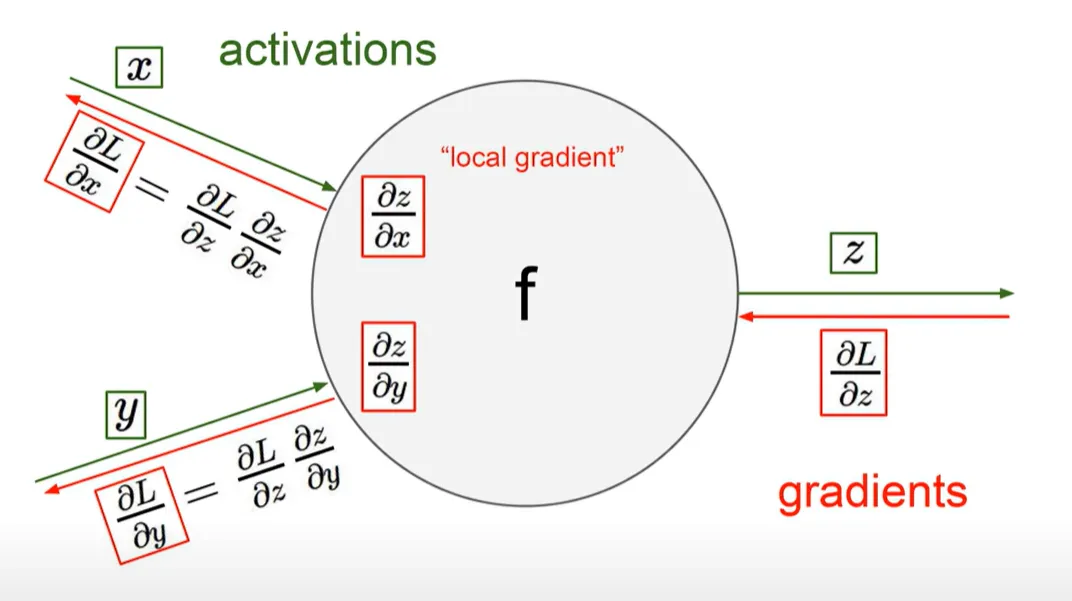 하나의 operator f에 대한 local gradient가 있다. 여기서 계산되는 결과 gradient는 이전에 계산한 gradient와 local gradient의 곱으로 표현된다.