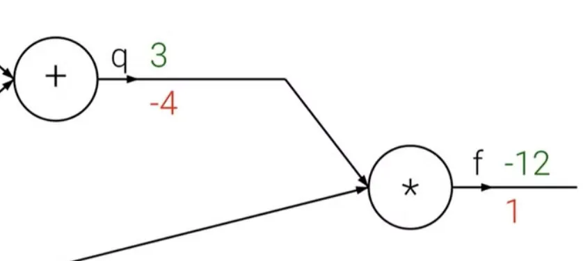 따라서 f를 q로 미분한 값은 -4이고, q를 x로 미분한 값은 1이 된다.