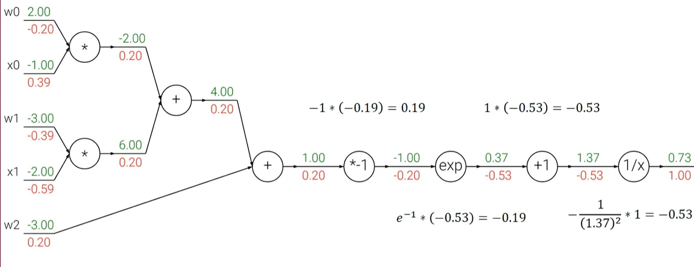 - $exp$ 게이트에서는 -0.53 이 흘러 들어오고 local gradient는 $e^{-1}$이 되어서 -0.2가 된다.