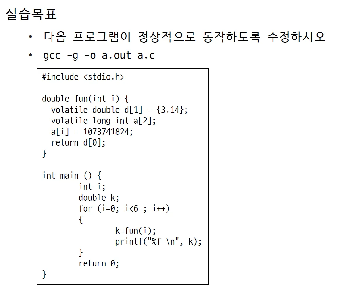 i가 2일때 3.14를 잘 출력하고, i가 3일때 stack smashed가 감지되어 종료된다. 당연히 배열의 범위를 넘어서 그렇다