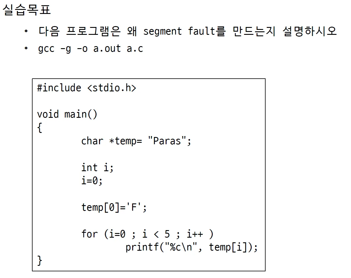 temp[0]='F' 에서 오류가 생김. 원인을 생각해보면 문자 포인터에 문자열을 저장하면, 문자열이 상수 리터럴 형태로 저장되므로 변경 불가능.