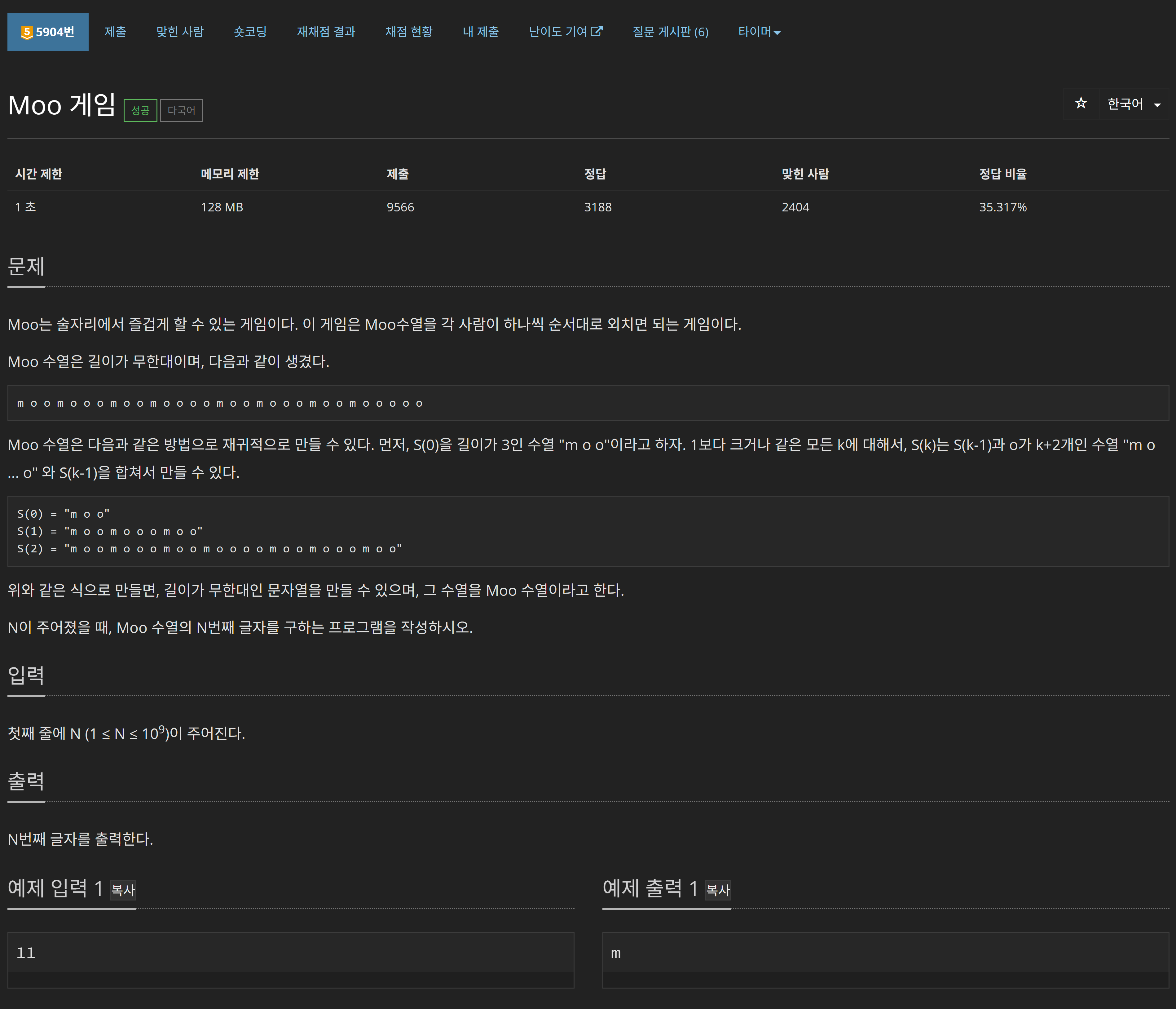 - k번째 moo 수열 S(k)에 대해 S(k-1)의 길이를 알면 S(k)를 알 수 있음. 그럼 길이를 가지고 뭘 할 수 있을까?