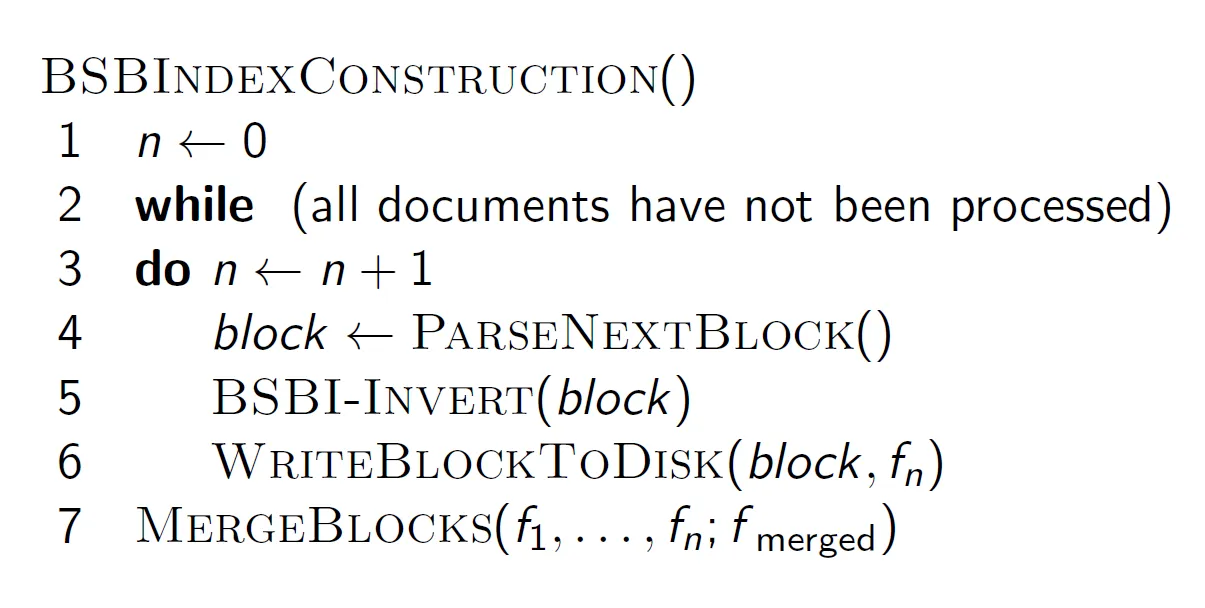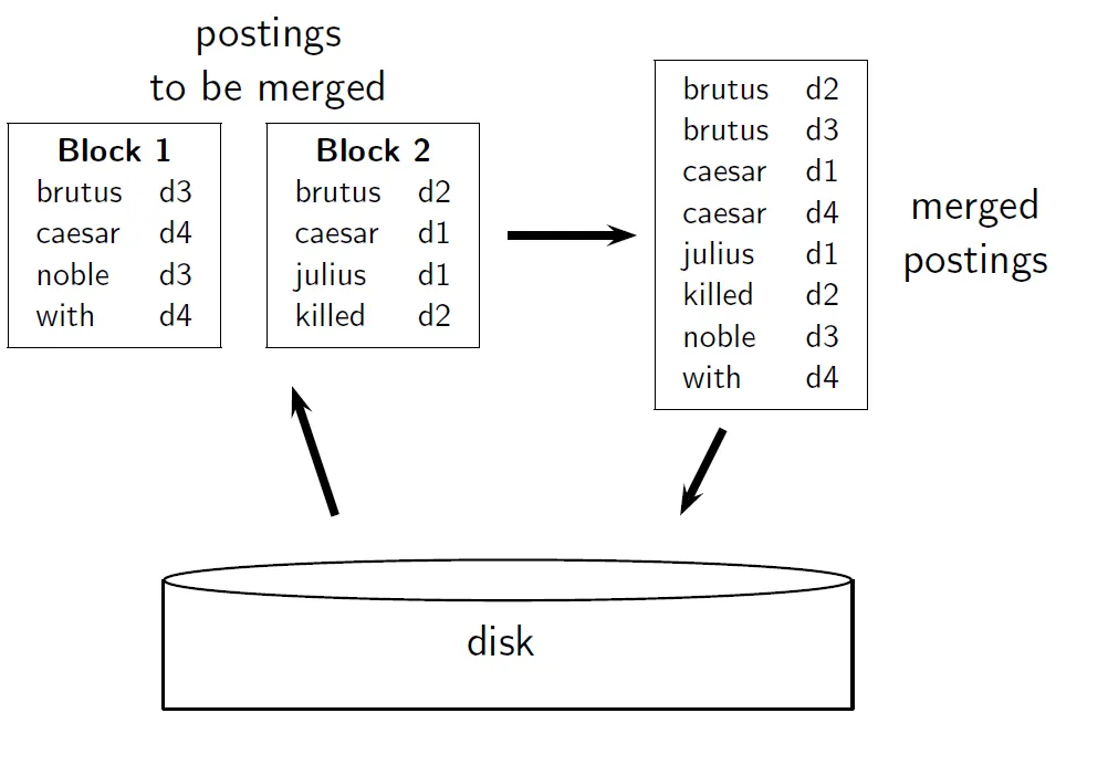 - block 단위로 문서를 메모리에 올리고 토큰화와 해당 문서 ID를 페어로 만든다. 그 후 정렬하여 디스크에 부분적인 inverted index를 쓰고, 모든 block에 대해 수행한 후 index 들을 merge 한다.