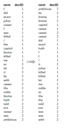 2. parser가 문서를 읽어서 문서 번호를 달고 토큰화한다. term, docID pair로 만드는 것.