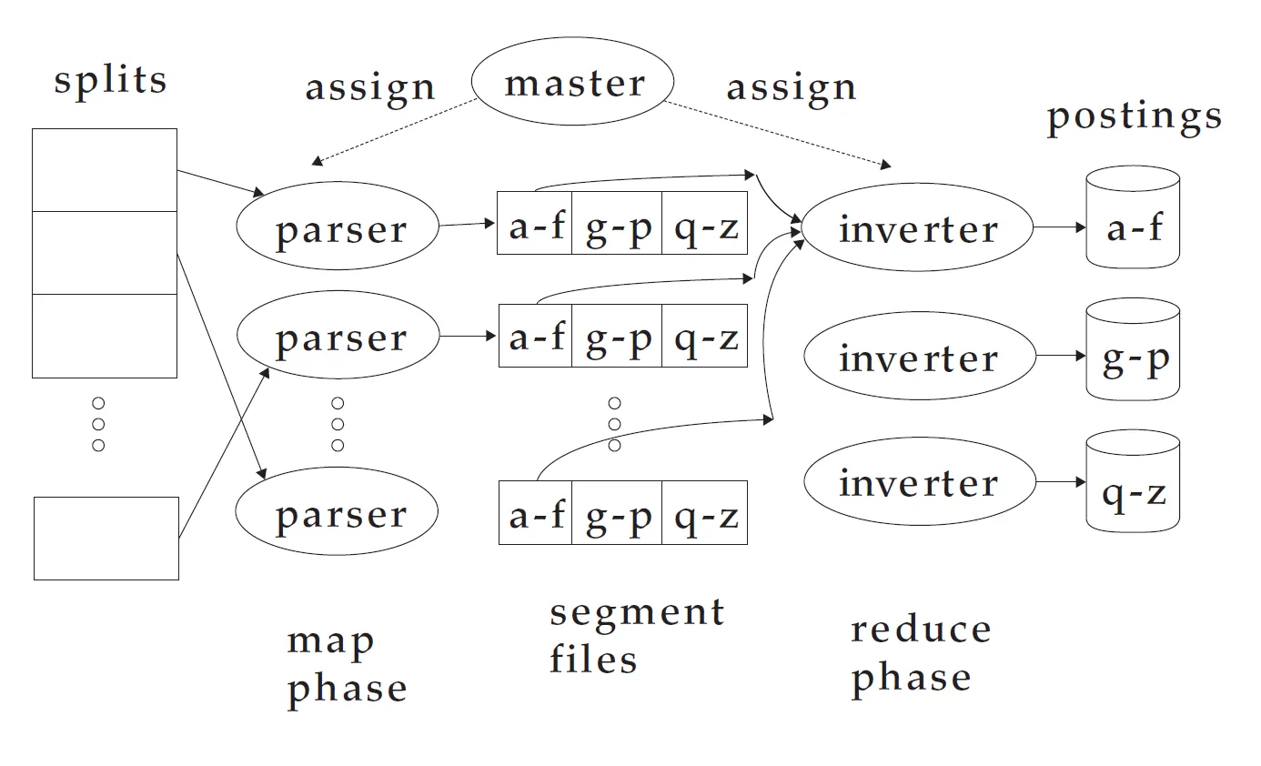각 split에 대해 parser가 토큰으로 뽑아내는 과정을 map phase라 하고 a-f, g-p, q-z 토큰으로 나눈걸 segment files, 토큰을 다시 모아서 inverter가 inverted index를 만드는 과정을 reduce phase라 한다.