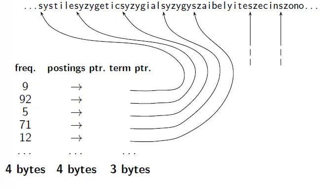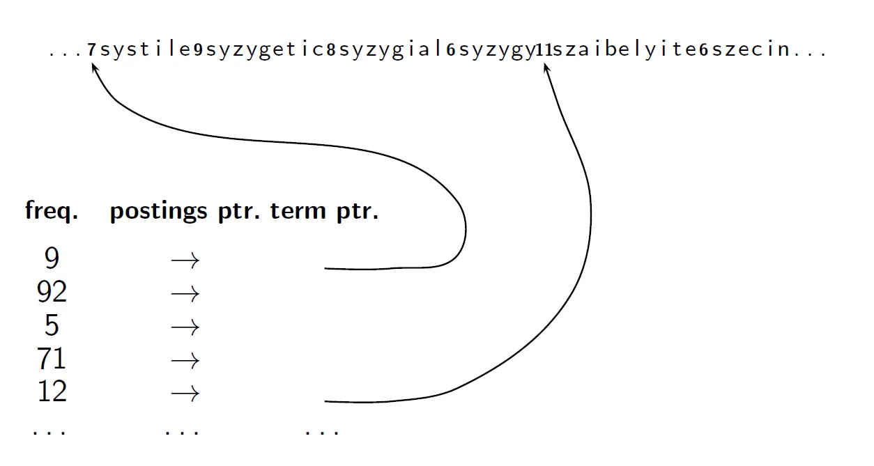 - 평균적으로 term의 길이는 8 byte를 사용해야 하지만 해당 방식은 각 용어의 위치를 가리키는 포인터에 3 byte를 사용한다.