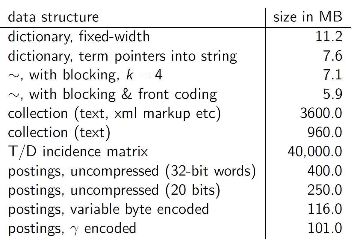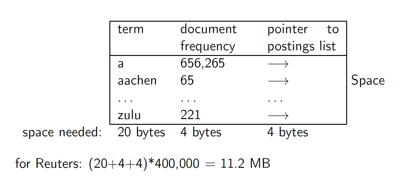 - 결론적으로 4(freq) + 4(posting ptr) + 3(term ptr) + 8(term in string) byte면 저장할 수 있다.