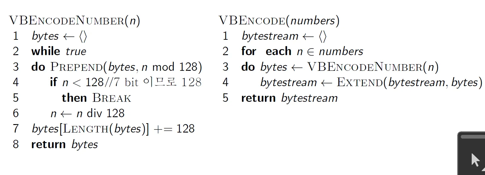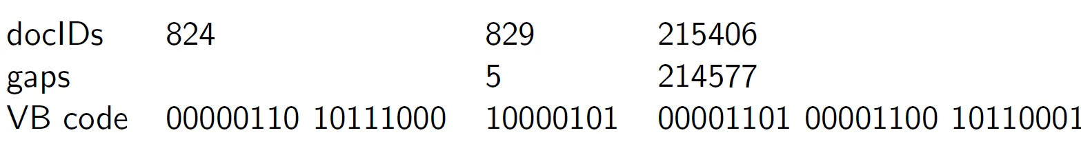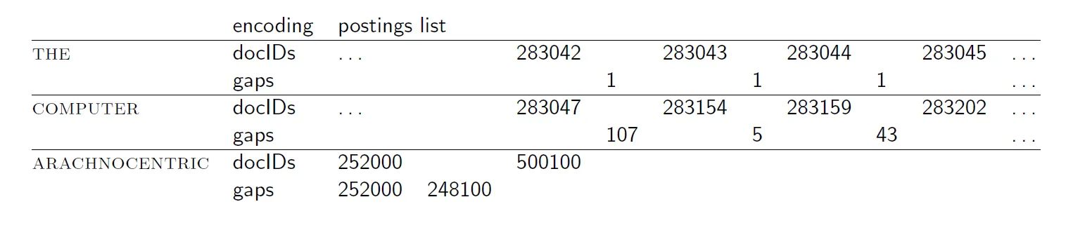 - docID 대신 문서 사이의 gap을 이용하는 방법이다.