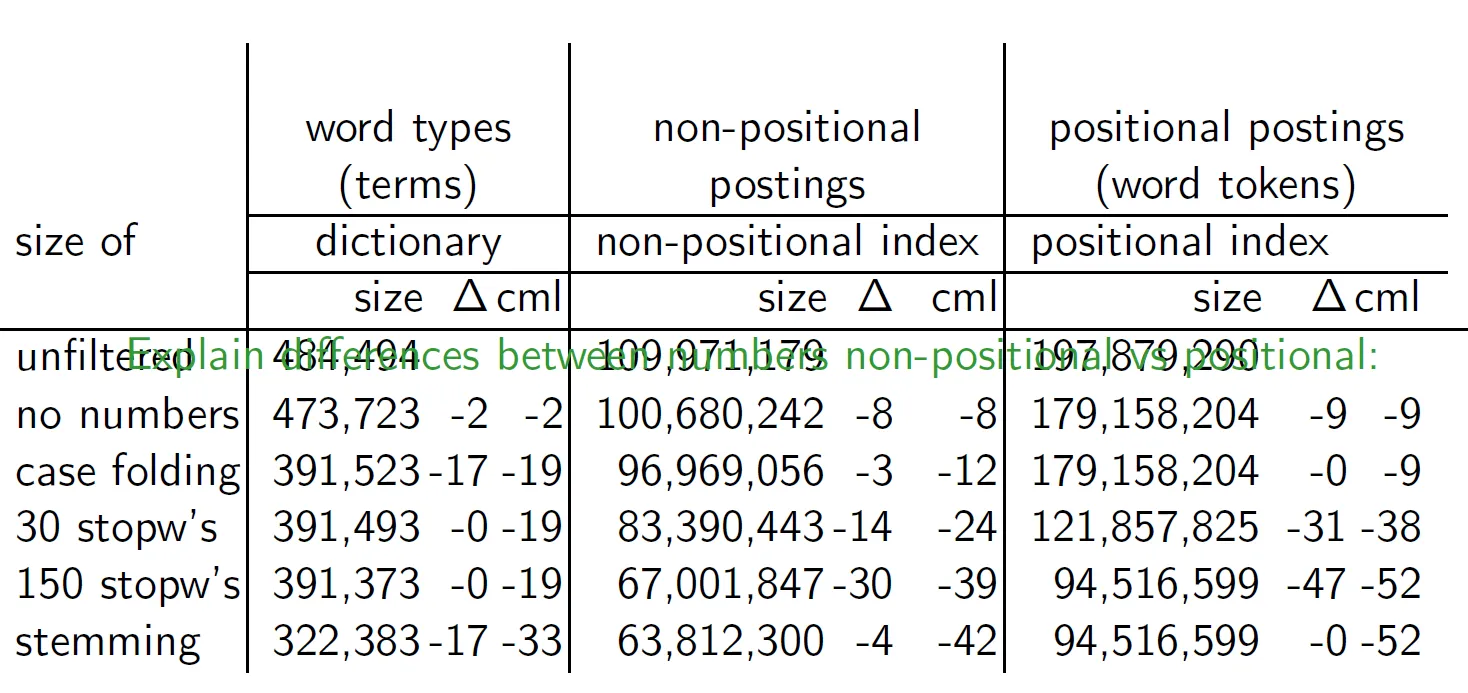 stop word를 30개 사용하나 150개 사용하나 dictionary에서는 차이가 없지만 non-positional index에서는 많이 차이난다.