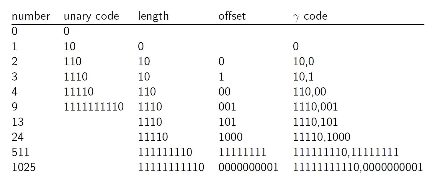 - gamma code는 gap을 length와 offset으로 표현한다.