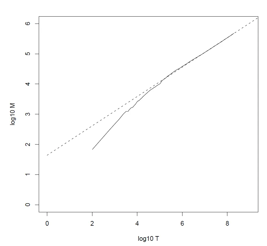 - log M = log k + b * log T log 3000 = log k + b * log 10000 log 30000 = log k + b* log 1000000 → k, b의 값을 구할 수 있고 그렇다면 Heaps law를 완성할 수 있다. Heaps law에 T = 2 * 10^10 * 200을 대입하면 M을 구할 수 있다.