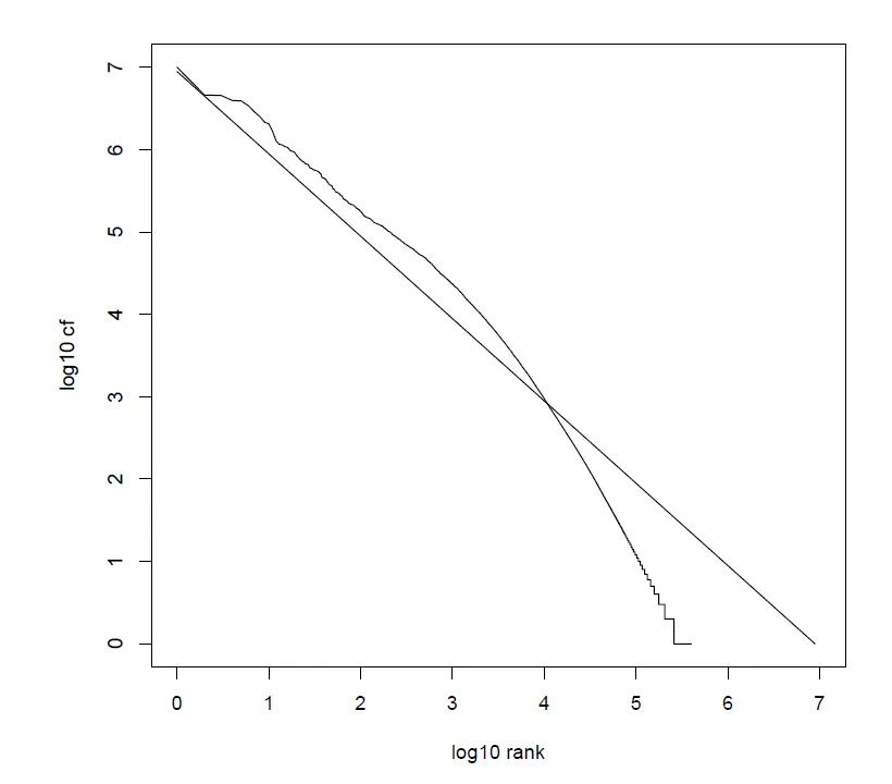 - 예를 들어 가장 많이 등장하는 단어 the를 cf_1 , 두 번째로 많이 등장하는 단어 of를 cf_2$라 하자.
