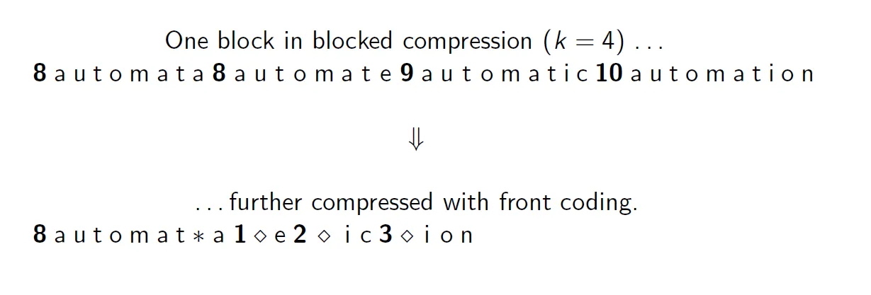 이런 방법을 front coding이라 한다. 공통되는 부분을 묶고 ◇로 대체시키는 방법이다.