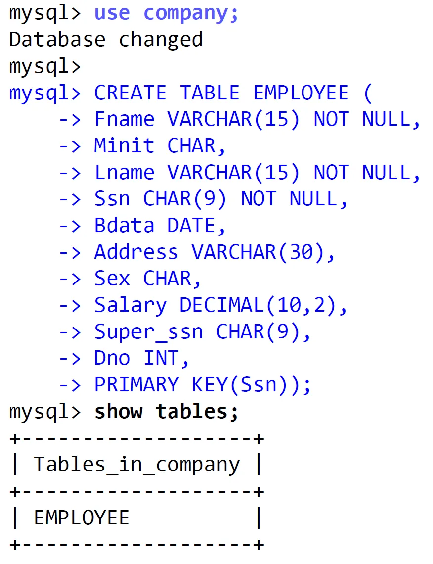 CREATE TABLE COMPANY.EMPLOYEE ...