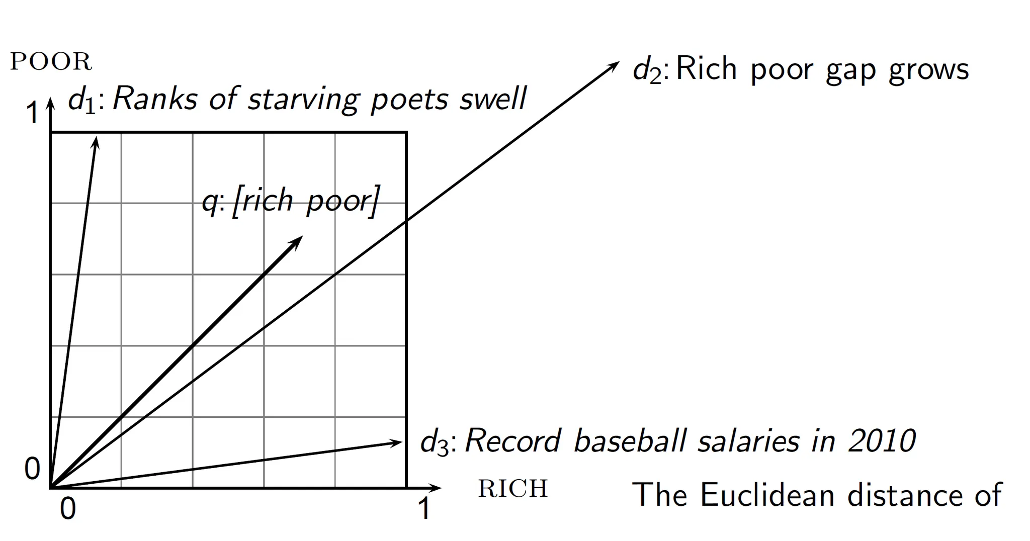 POOR, RICH 두 단어에 대해서만 벡터공간을 만들고 [rich poor] 질의가 들어온 상황이다.