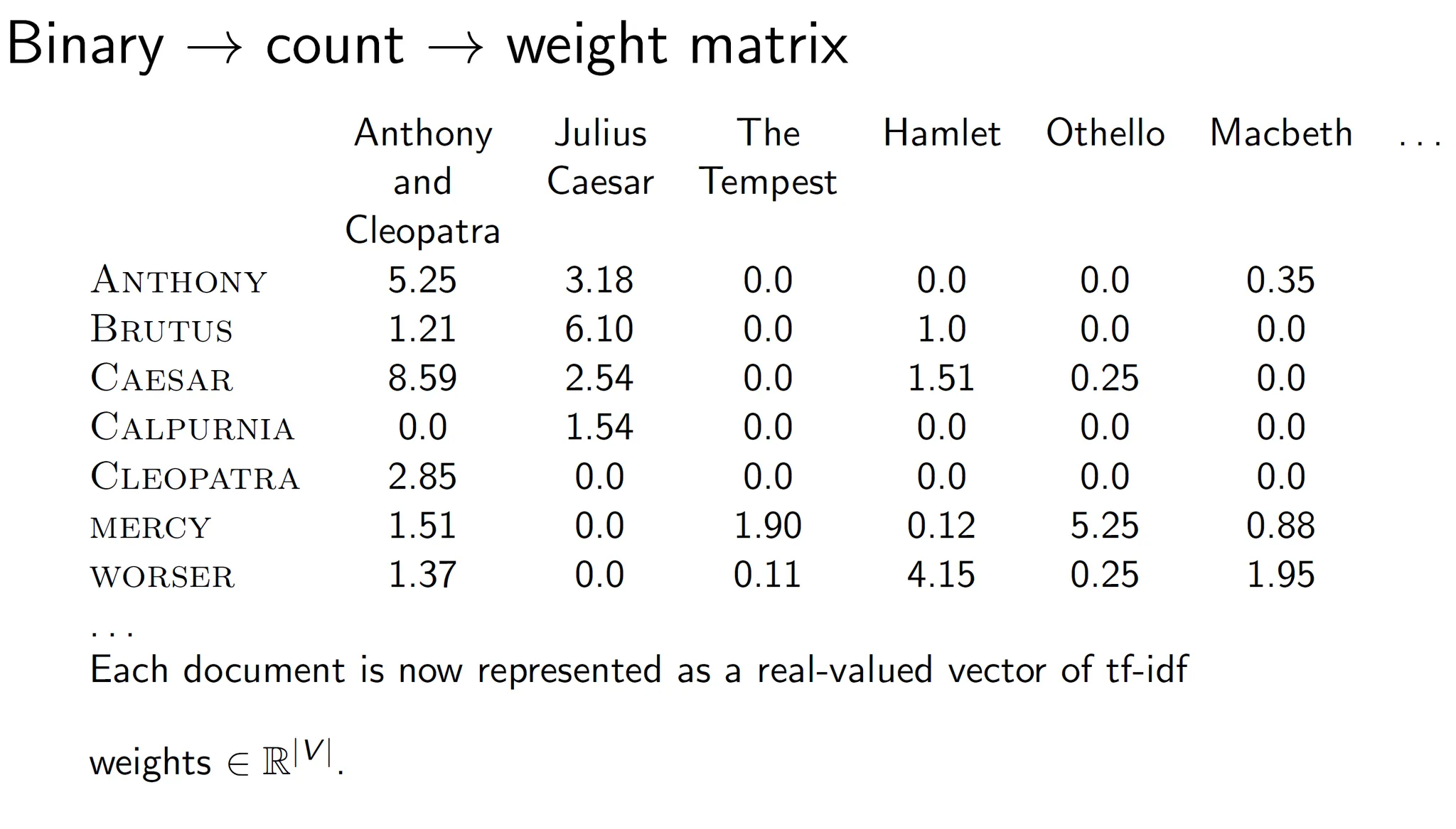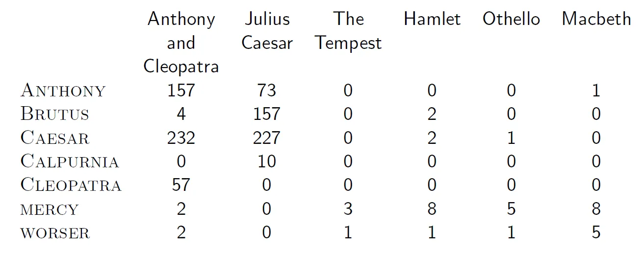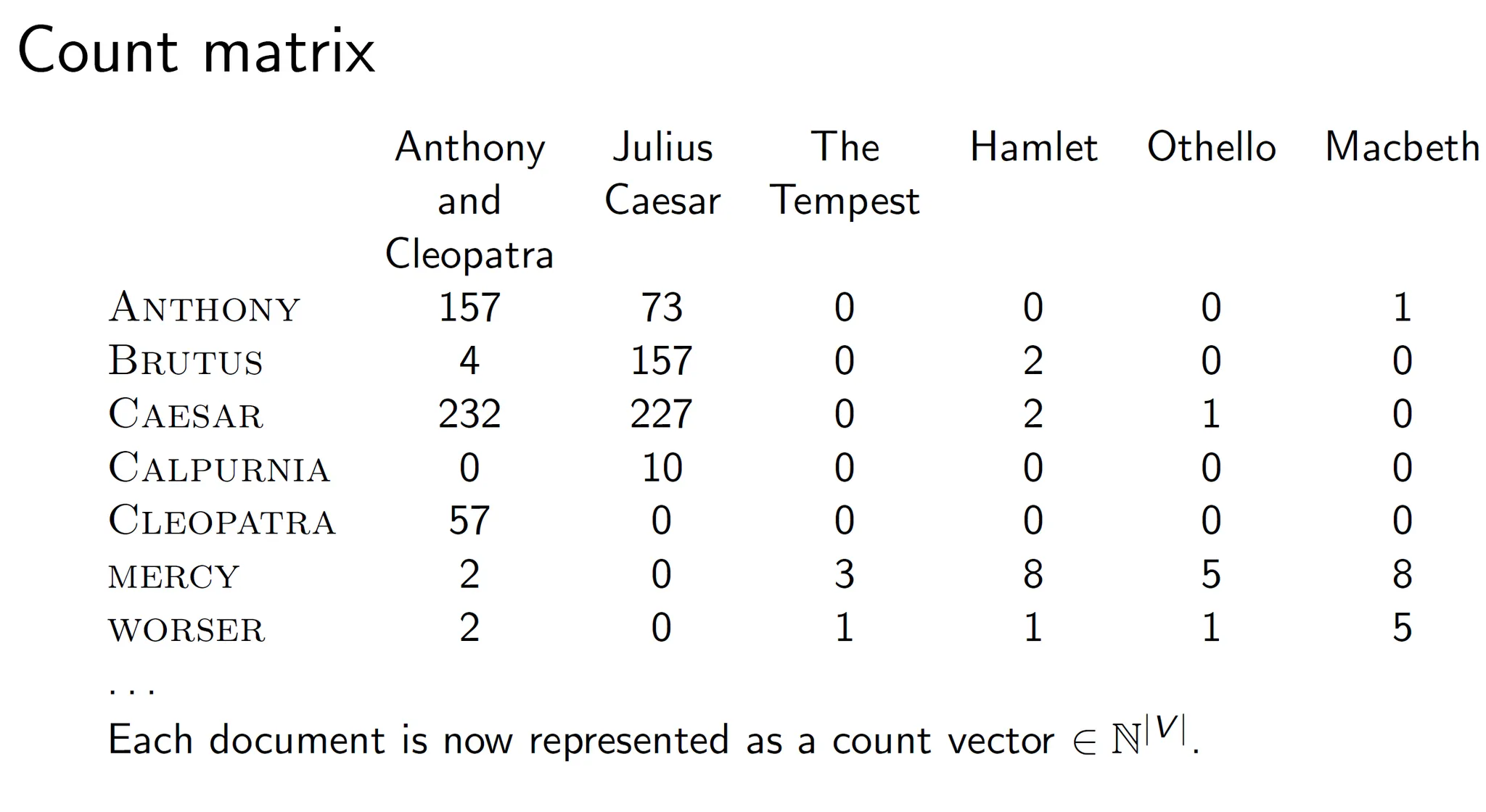 여기서 2진수 대신 term frequency를 적어주면 Count matrix가 된다. 여기서 document vector는 $N^{|V|}$가 된다. N은 정수를 나타낸다. vector가 정수의 vocab size의 차원으로 나타난다는 뜻이다.