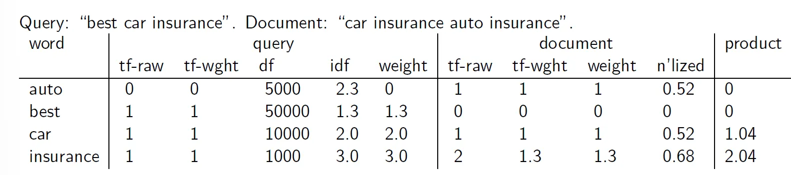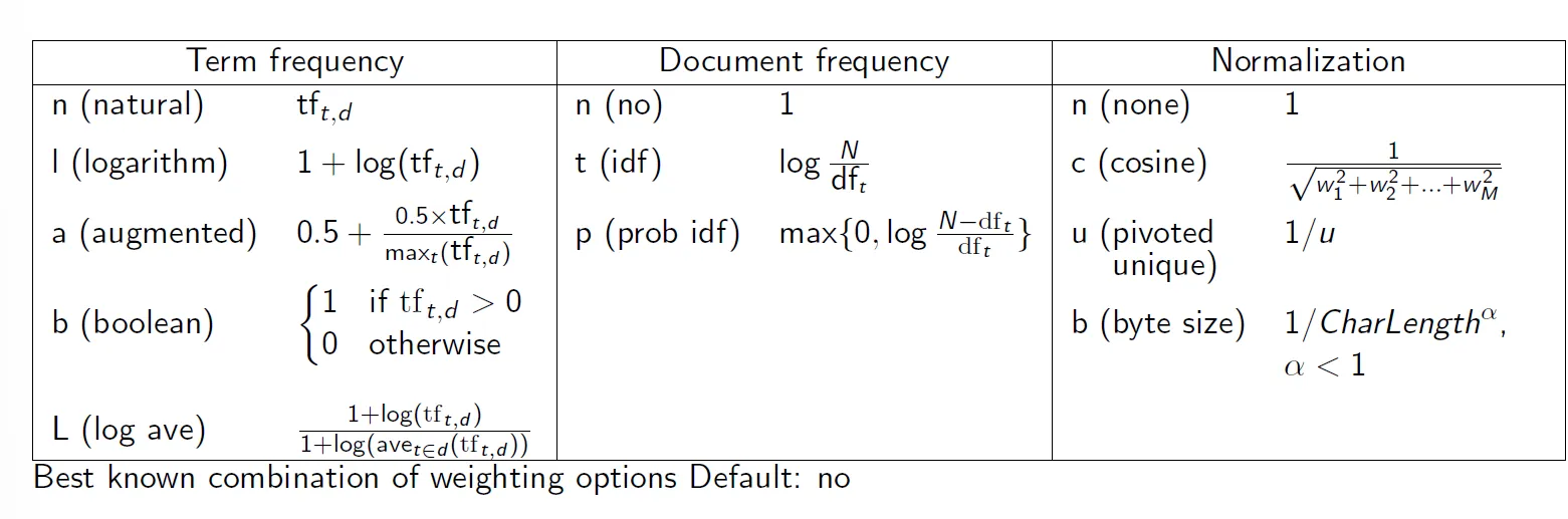 - query에 대해 tf : log, df : idf, normal : no