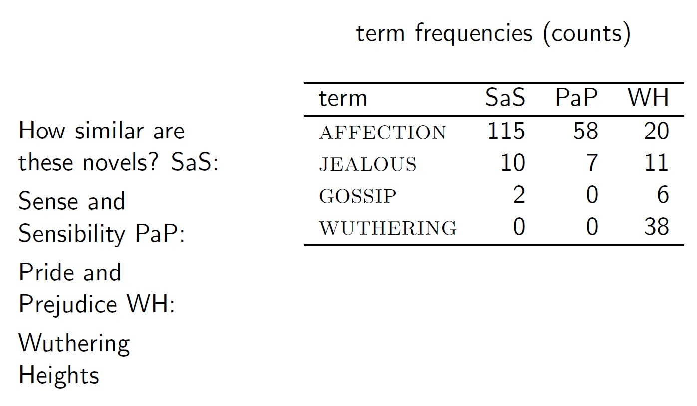 이 세가지 소설의 유사도를 구하기 위해 소설에 나오는 단어의 frequencies를 구해보았다.
