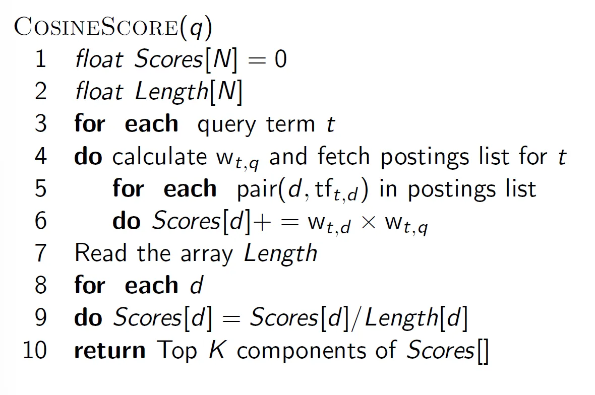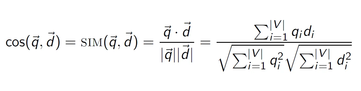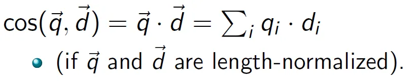 qi, di의 tf-idf weight를 값으로 주면 q와 d의 cosine 유사도를 구할 수 있다.