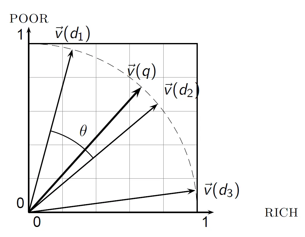 실제로는 d2가 쿼리와 굉장히 가까운데 Euclidean distance는 d1과 더 가깝다. Euclidean distance는 벡터의 크기가 포함되기 때문이다.