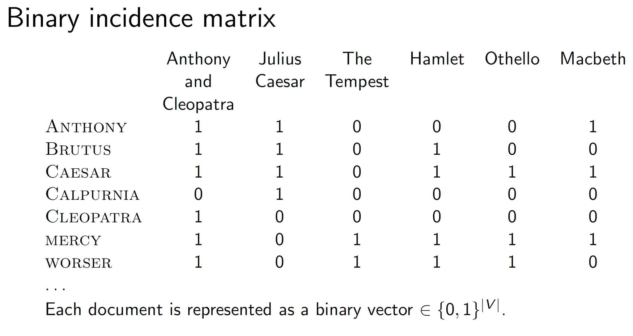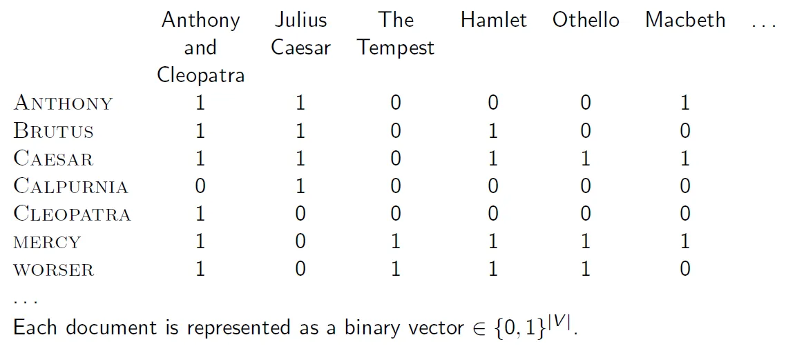 term document incidence matrix를 생각해보면 단어가 문서에 존재하면 1이다. 2진수로 나타나게 된다. 따라서 document vector가 \{0, 1\} ^ {|V|}가 된다. V는 vocabulary size이다.