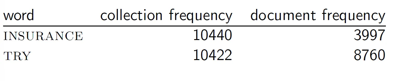 - 두 term은 비슷한 cf를 갖지만 INSURANCE는 더 적은 수의 문서에서 등장한다. 따라서 INSURANCE가 특정 주제와 관련이 더 높은 중요한 단어이다.