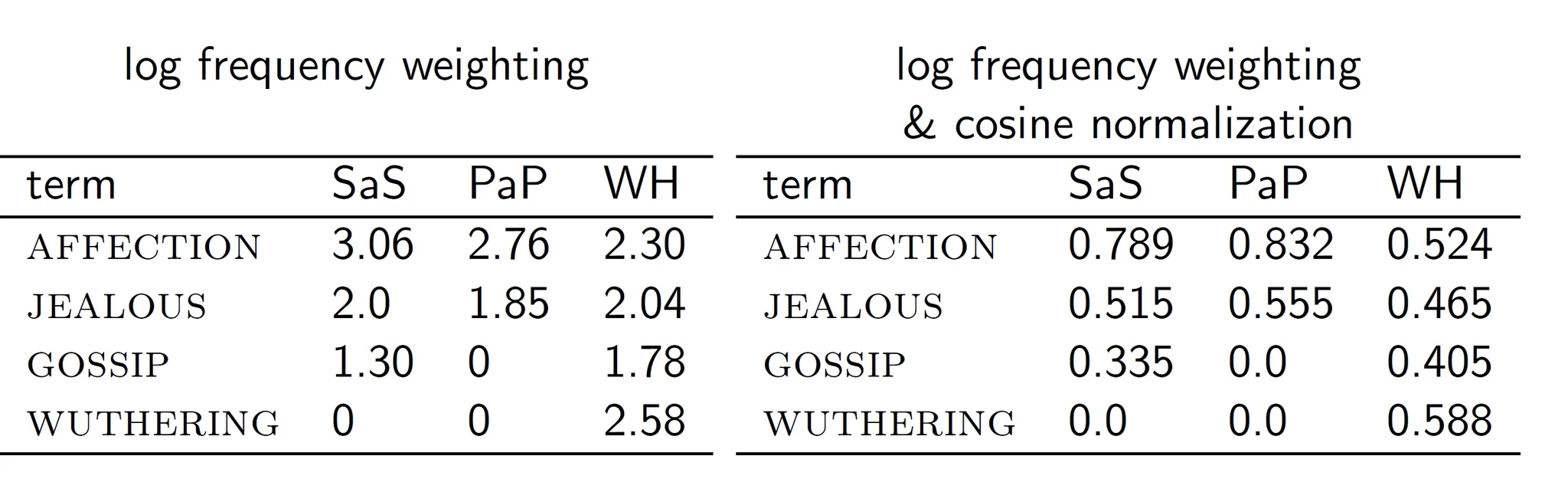 normalization이 됐으므로 각 문서의 내적을 구해서 유사도를 구해보면 cos(SaS, PaP) = 0.94 정도가 나온다. 한 번 계산해보자.