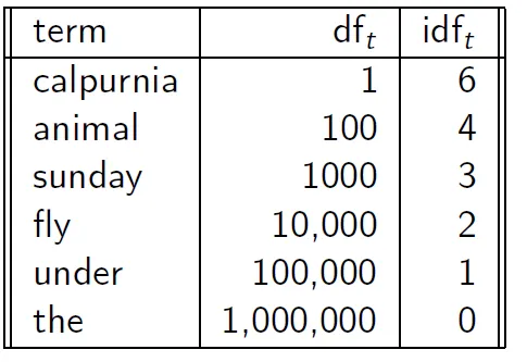 위의 예시를 생각해보면 N을 10^6이라 했을 때 idf를 계산할 수 있다.