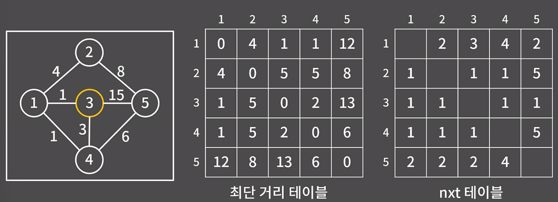 그 다음은? 1에서 5까지 갈 때 그 다음에 갈 곳은 nxt[1][5]에 저장되어 있다. nxt[1][5]는 4이므로 3 -> 1 -> 4 까지는 구했고, 그 다음은 nxt[4][5] = 5로 3 -> 1 -> 4 -> 5의 경로 완성이다.