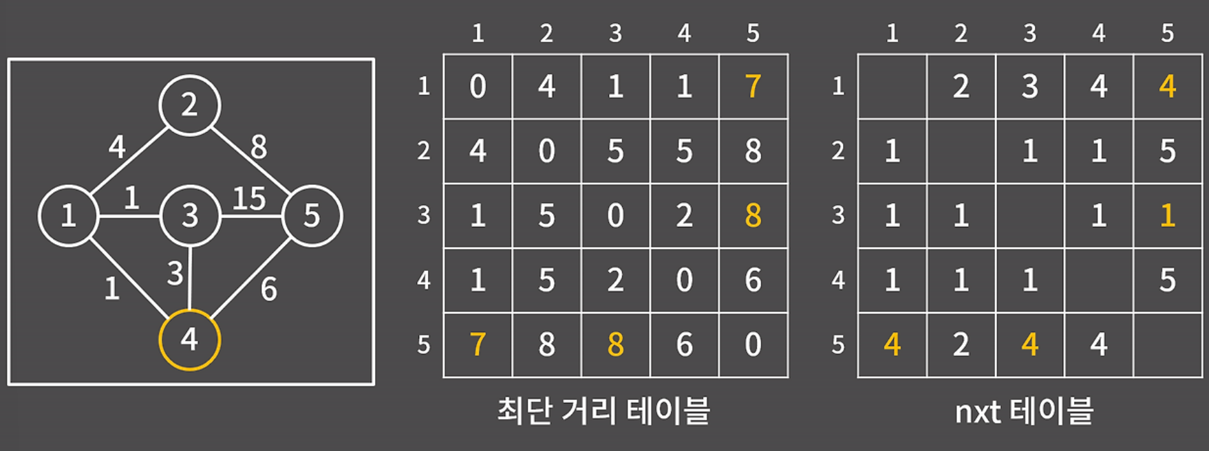 이번에는 3->5가 특이하다. 이 전까지는 3->1->2->5가 최단 거리였고, nxt에는 1이 저장되어 있었다. 4번 노드를 거치게 되는 경우를 생각해봐도 3->1->4->5이므로 똑같이 nxt에도 1이 저장된다.