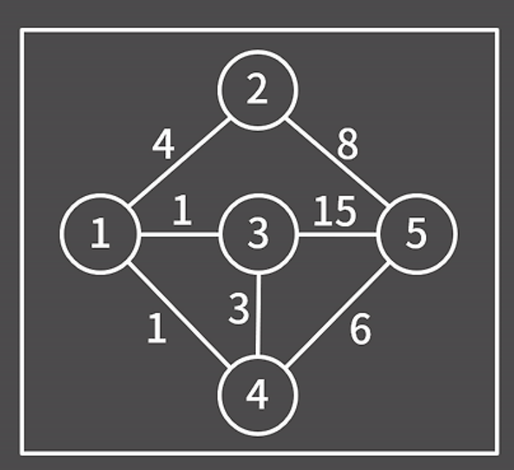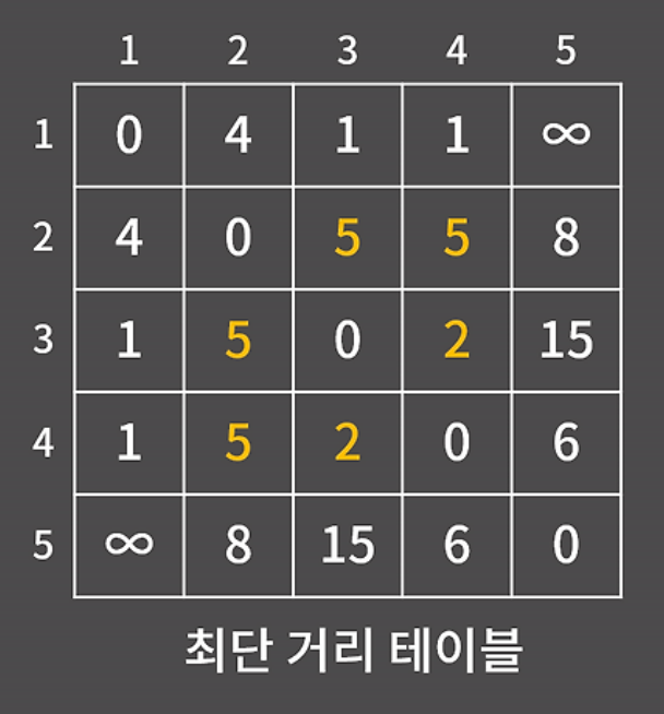 1에서 1로 가는 거리는 당연하게도 0이고 1에서 2는 바로 갈 수 있기에 그 가중치인 4를 적어주면 된다. 3에서 5의 경우 4를 거쳐서 간다면 8로 갈 수 있지만 현재는 하나의 간선만 고려하기에, 즉 바로 갈 수 있는 경로만 고려하기에 15로 구해진다.