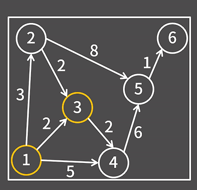 - 현재 확정된 정점은 1, 3 이다. 1, 3에서 도달할 수 있는 정점은 다음과 같다.