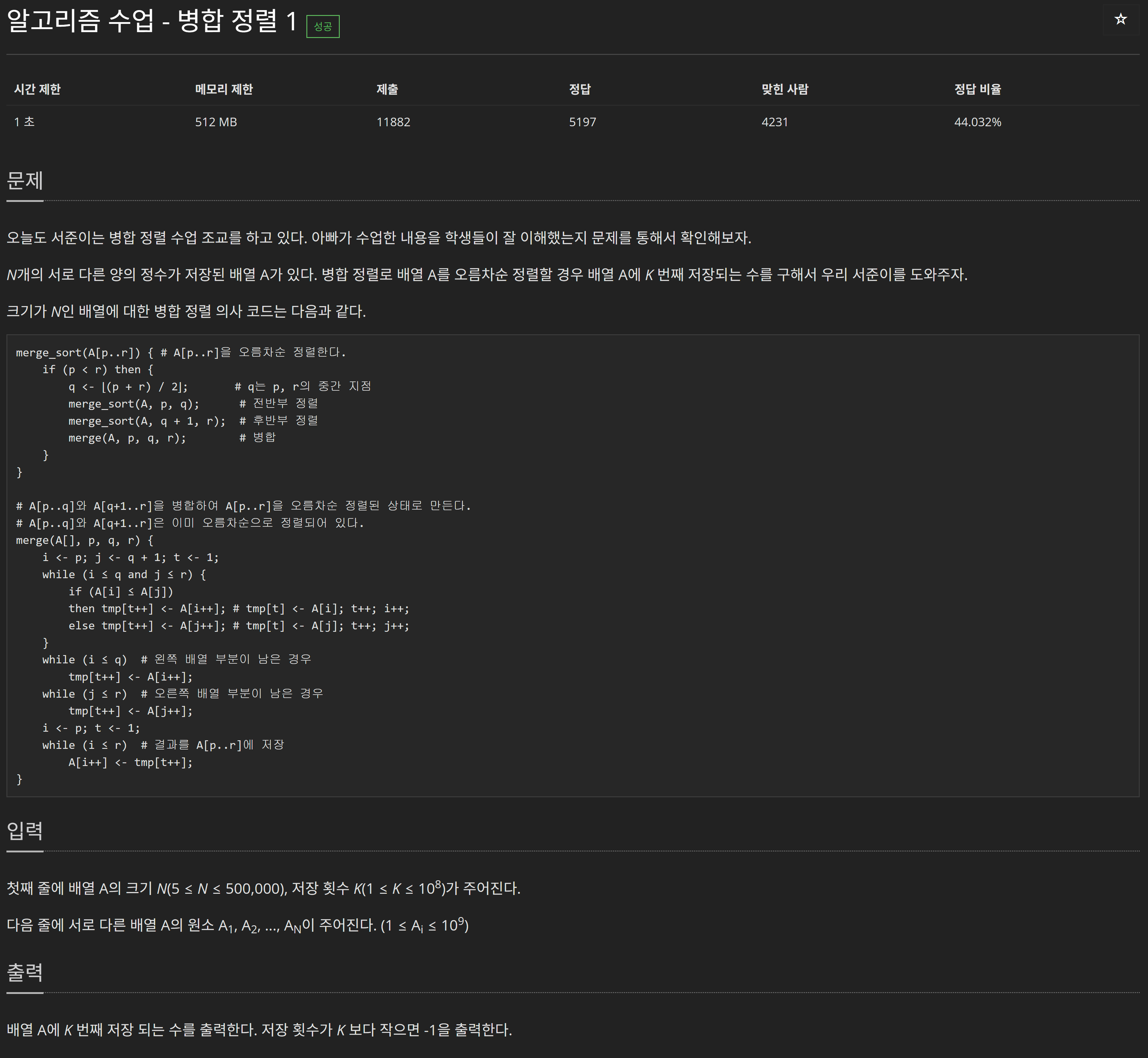 병합정렬만 구하면 풀리는 문제다. K 번째 저장되는 수라는 말이 조금 헷갈리는데 간단하게 주어진 퍼수도코드대로 구현했을 때 병합 결과를 저장하는 부분에서 K 번째 저장되는 수를 구하면 된다. 병합 정렬을 공부하고 특징, 장단점을 숙지하면서 구현해 보기 좋은 문제이다.
