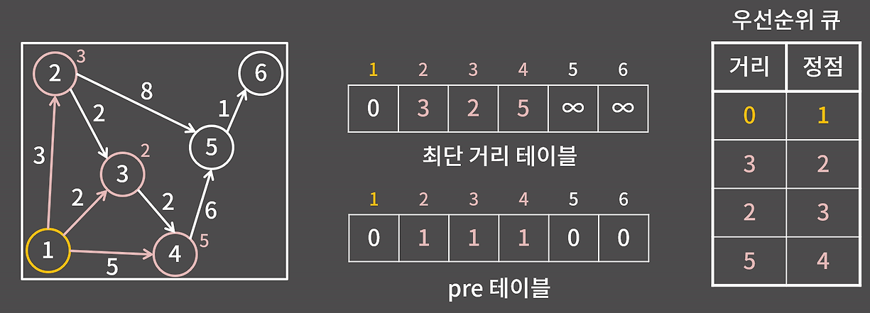 이렇게 1번 정점만 확정하고, 연결된 정점들을 우선순위 큐에 넣으면서 dist 테이블이 업데이트되고, pre[nxt]에는 cur을 넣게 된다.