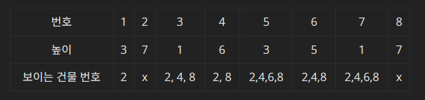 4번 건물 : 8 // 기존 관찰 가능하던 6이 자신보다 높이가 낮아서 관찰할 수 없다. 여기서 한 가지 통찰을 얻었는데, 7번 건물은 한 번 관찰이 불가능하니 계속 불가능하다. 한 방향으로 제한했기에 규칙을 확정할 수 있다.