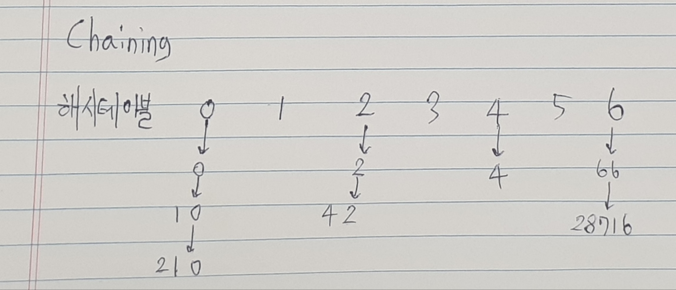 Chaining에서는 해시 테이블의 각 인덱스마다 연결 리스트나 동적 배열을 하나씩 두고, 삽입이 발생하면 해당 인덱스의 연 리스트에 값을 추가한다. 이러면 충돌이 일어나도 편하게 연결 리스트에 추가해 주면 된다. 삽입/삭제도 같은 원리로 가능하다. 이 방법은 최악의 상황에서도 탐색/삽입/삭제에 O(N)을 보장한다.