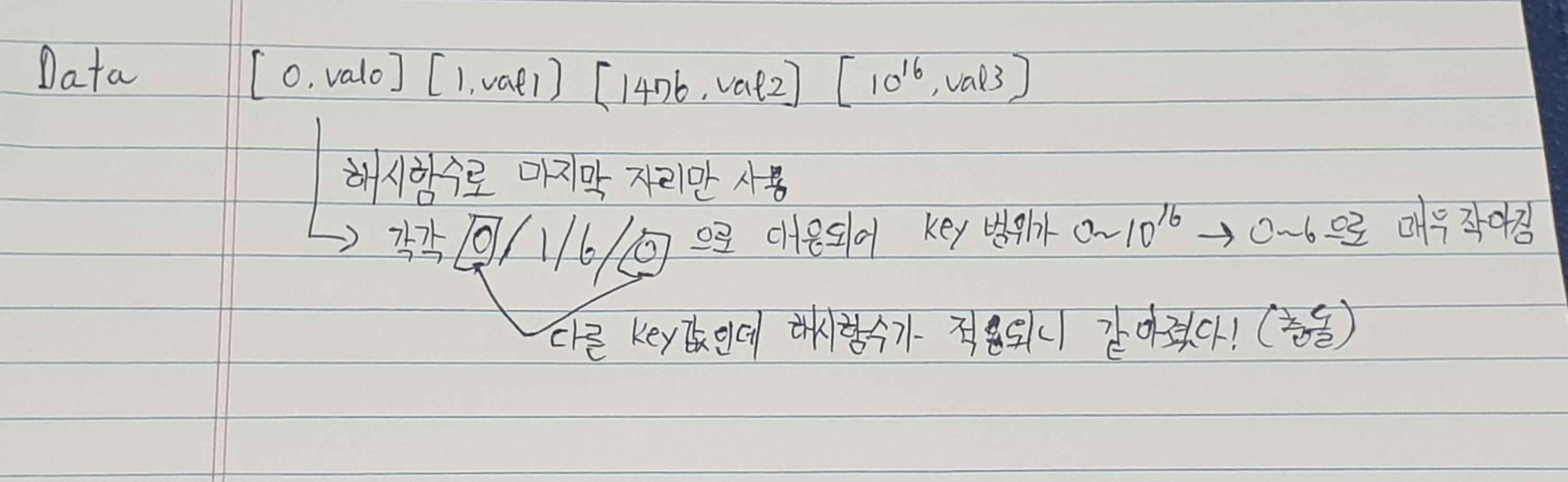 해시 테이블은 임의의 길이를 가진 key값에 해시함수를 적용해 고정된 크기의 index를 생성하여 그 index에 값을 저장/삭제/탐색하는 자료구조이다. 해시 함수는 간단하게 나머지 연산자를 이용할 수 있고 다른 다양한 방법들이 많다. 해시 함수에서 가장 중요한 점은 충돌이 적게 일어나는 해시 함수를 짜야한다는 것이다. 충돌은 또 뭘까?