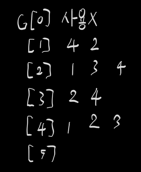 구현할 때 주의할 점은 벡터들을 함수에서도 이용해야 하므로 전역 변수로 선언하면 편하다는 점과 벡터 배열로 동적 배열을 구현하는 부분이었다. 벡터 배열을 처음 다룬다면 조금 헷갈릴 수 있다. vector <int> G [N];과 같이 사용할 수 있는데, 이 말이 뭐냐면 사이즈가 정해지지 않은 벡터를 N개 만들어 주세요~라는 뜻이다. 그 후 G[i].push_back(x);와 같은 방식으로 i번째 벡터의 가장 뒤에 원소 x를 넣는 식으로 사용할 수 있고, i번째 벡터는 이차원 배열의 i행에 해당한다. 예제의 그래프를 벡터 배열로 나타내면 아래와 같다.