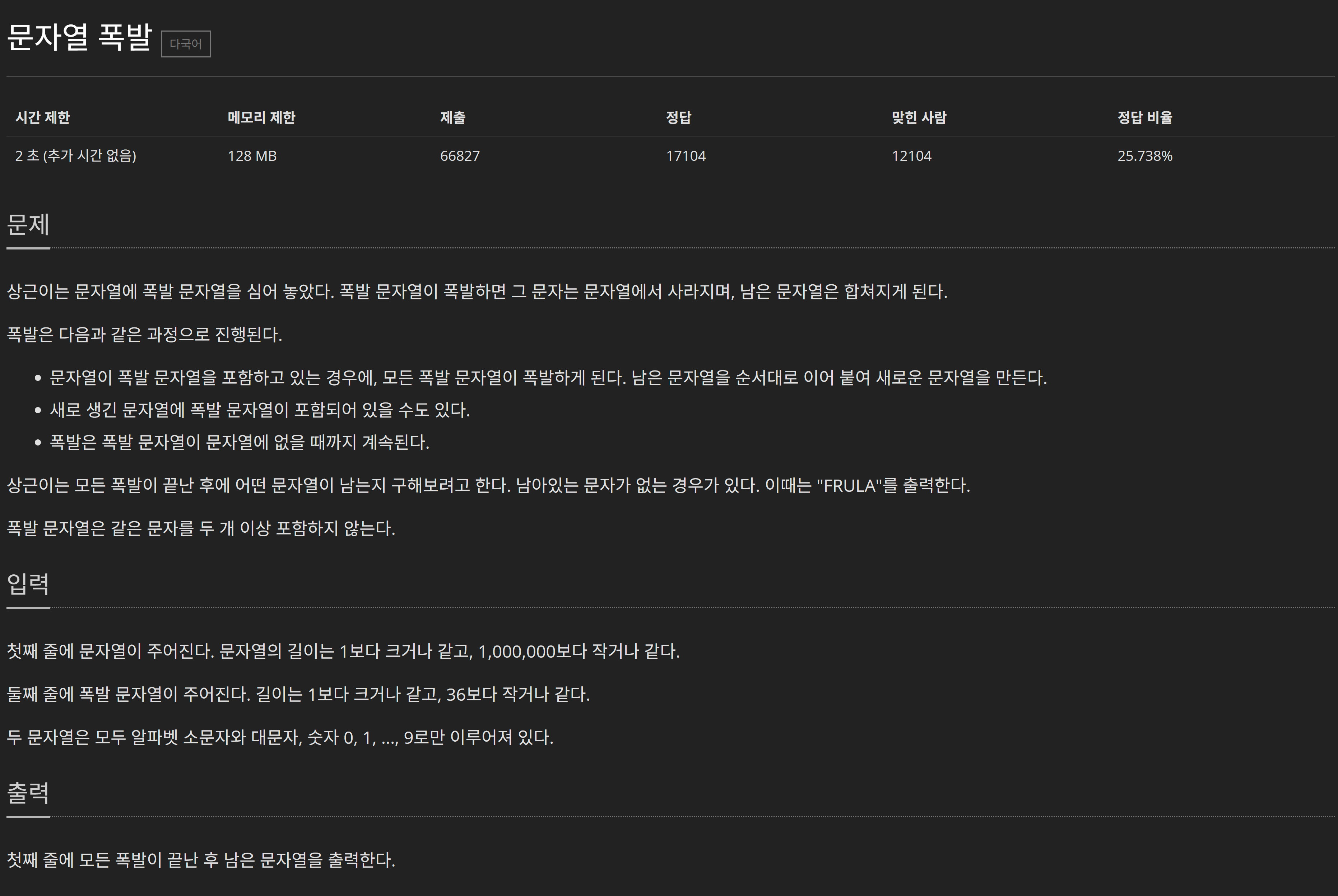첫째 줄에 문자열이 주어진다. 문자열의 길이는 1보다 크거나 같고, 1,000,000보다 작거나 같다. 둘째 줄에 폭발 문자열이 주어진다. 길이는 1보다 크거나 같고, 36보다 작거나 같다. 두 문자열은 모