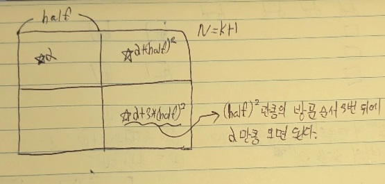 N=0일 때 (r, c)의 방문 순서는 0인게 자명하다. N=k 일 때 (r, c)의 방문 순서를 α로 알고있다고 가정하자. 또 half는 한 변의 길이의 반으로 정한다. N=K+1일때