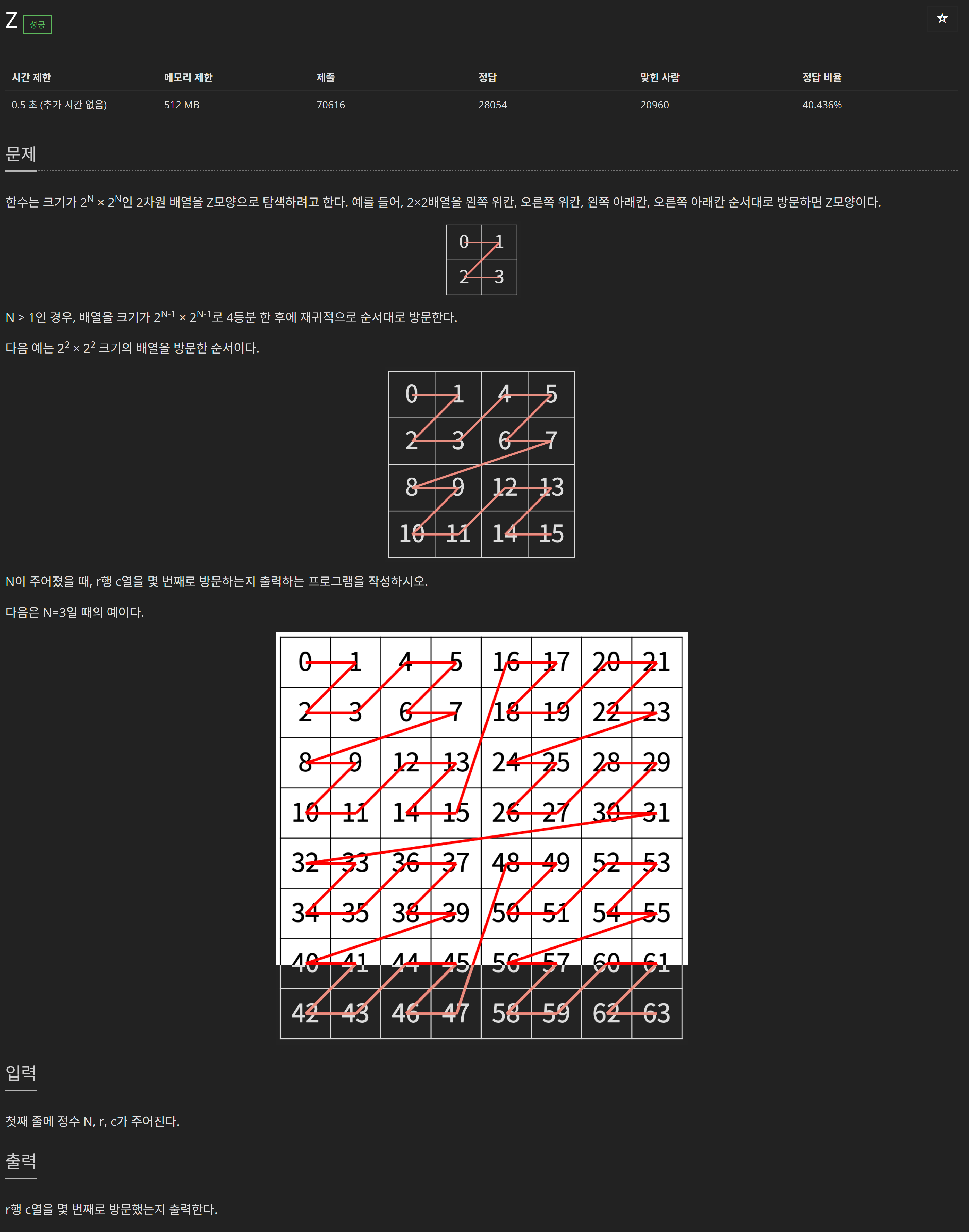 먼저 문제를 파악해 보자. 한 변의 길이는 2^N이다. 또, 문제 풀이의 방향은 문제에서도 재귀를 언급하고 N=k-1일 때의 (r, c) 방문 위치를 N=k일 때 사용할 수 있으므로 재귀로 잡고 가자. 재귀로 푼다는 것은 귀납적으로 사고해야 한다는 뜻이다.