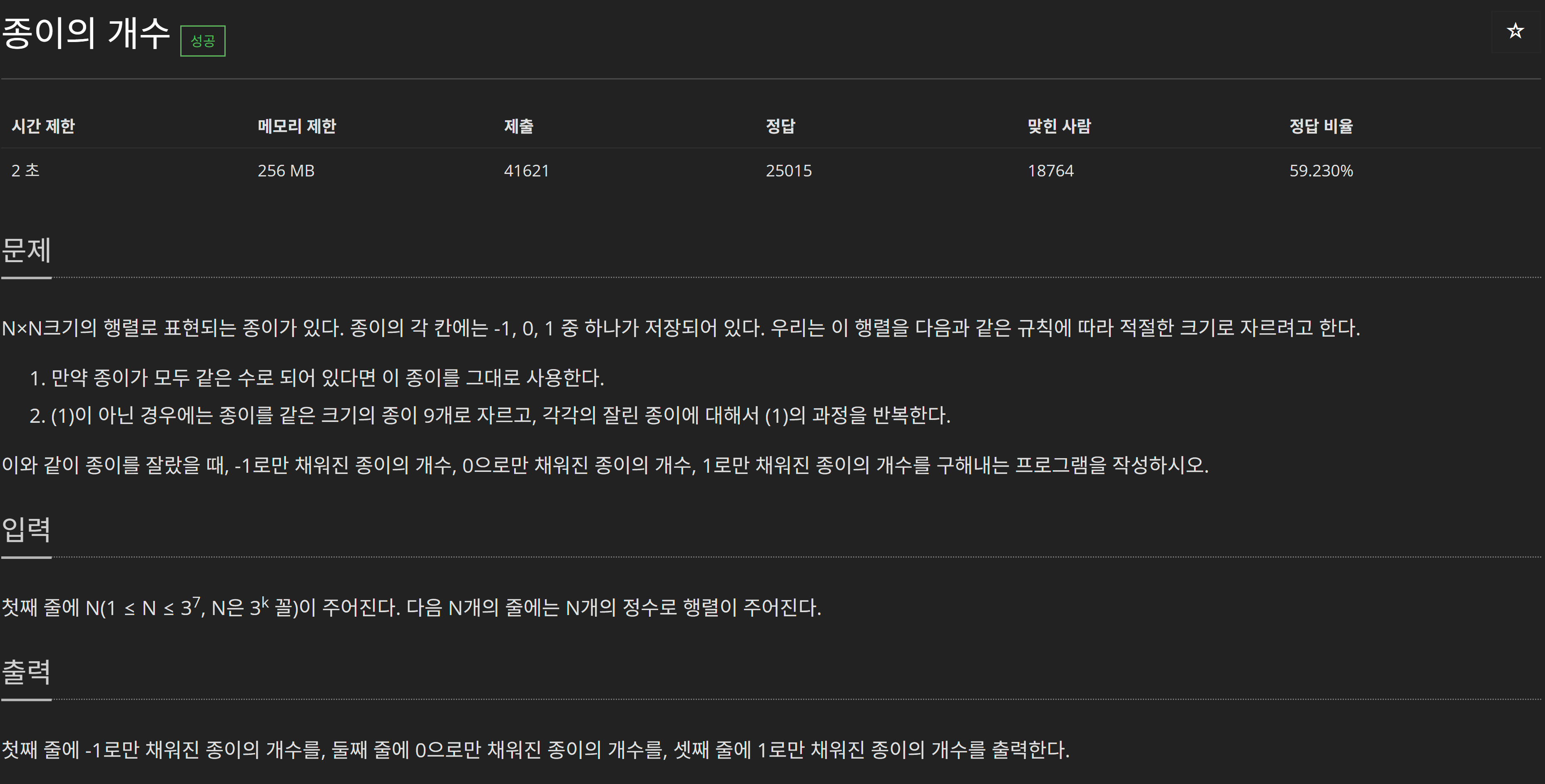 N×N크기의 행렬로 표현되는 종이가 있다. 종이의 각 칸에는 -1, 0, 1 중 하나가 저장되어 있다. 우리는 이 행렬을 다음과 같은 규칙에 따라 적절한 크기로 자르려고 한다. 만약 종이가 모두 같은 수