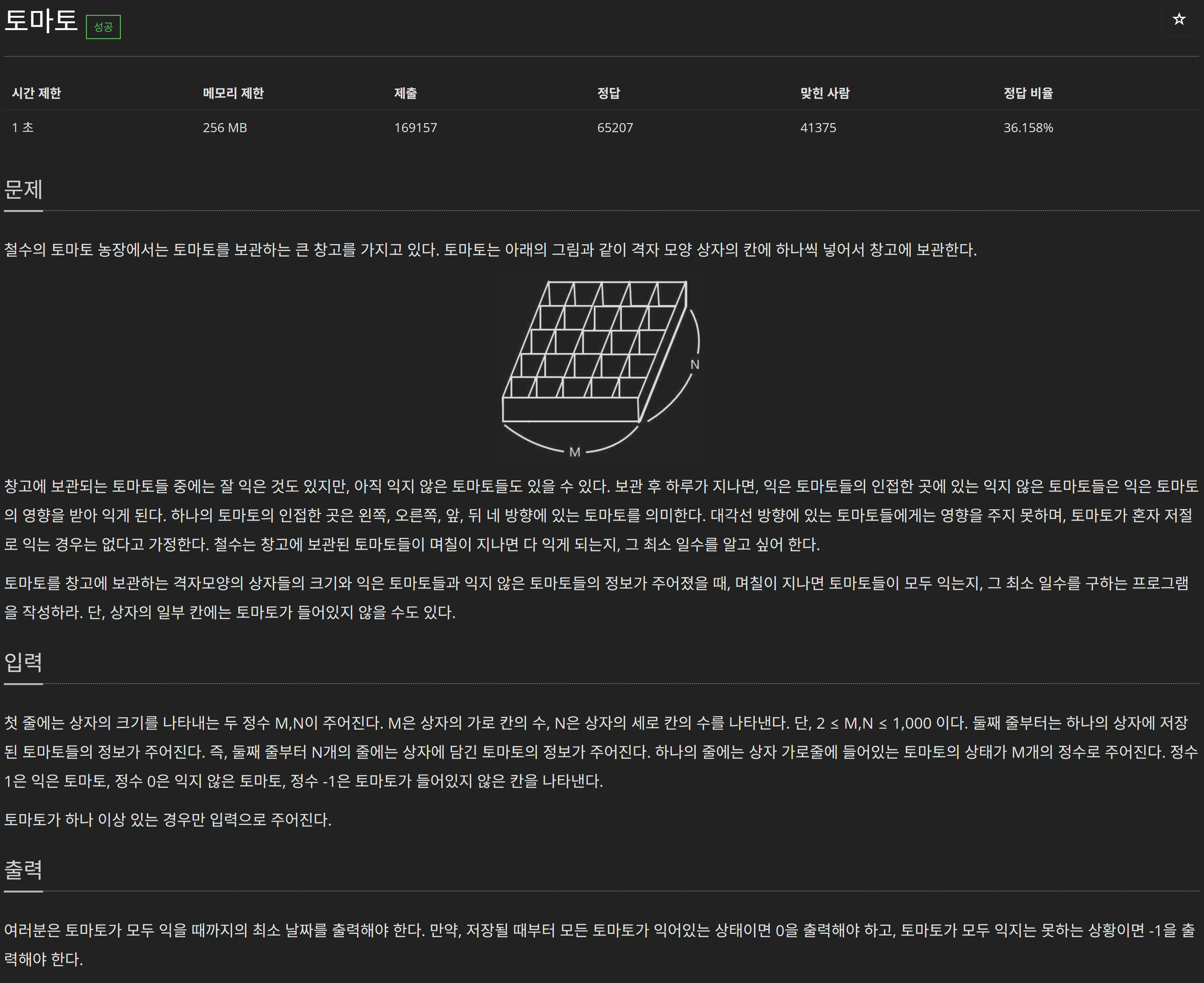 // 토마토가 없는 칸은 0으로 그냥 둬서 이미 방문한것과 같게 처리한다.