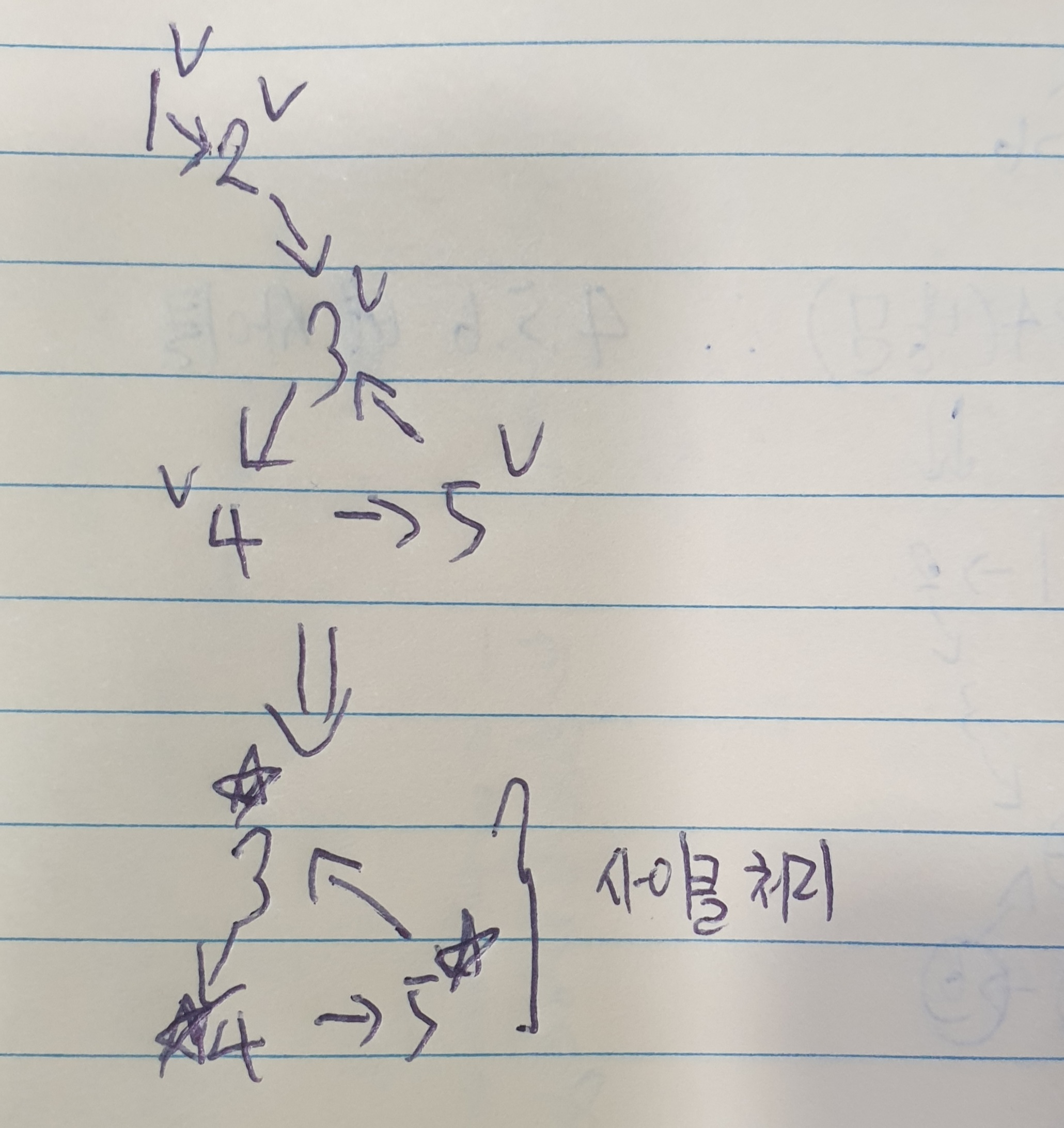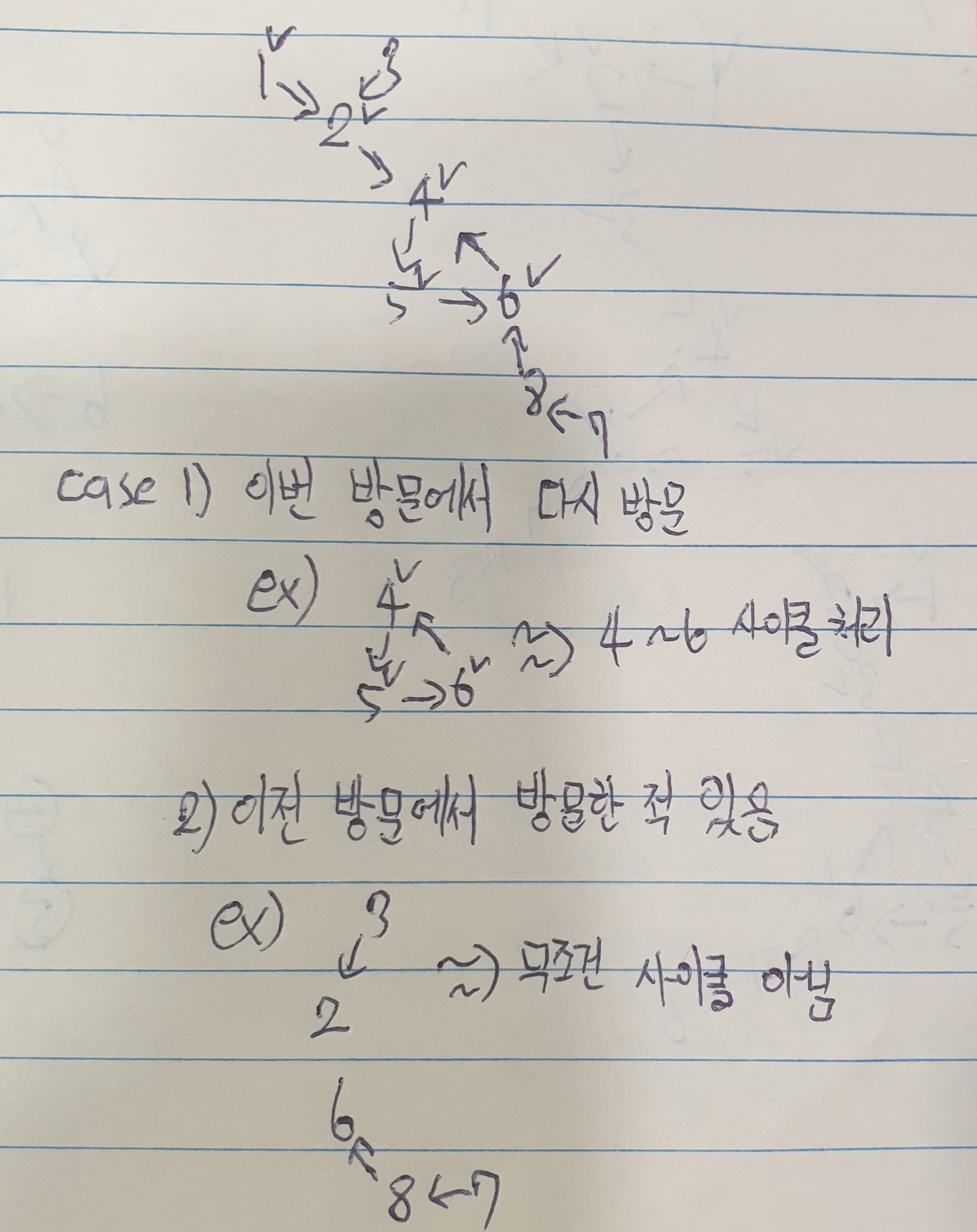 이 두 점을 최적화 하면서도 bfs를 생각해 보면 x번부터 방문을 시작하다가 사이클이 나오면 사이클만 방문 표시를 지우고 사이클로 표시하고, 이런 방식을 떠올렸다. 예를 들면 아래와 같은 상황이다.