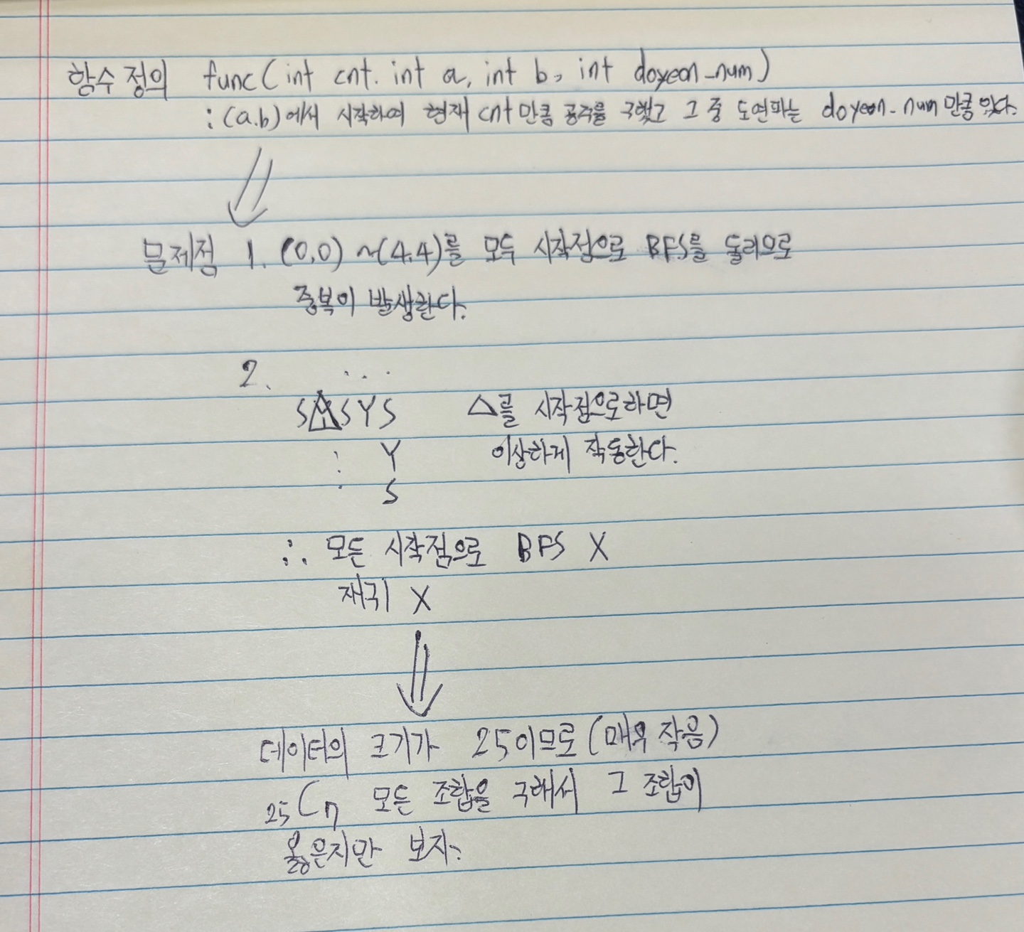 처음에는 일반적인 백트래킹으로 접근했다. 어차피 데이터의 크기가 25로 매우 작고 시간은 2초로 여유롭니 모든 점을 시작점으로 두고 O(25) 재귀식을 상하좌우 중 방문할 수 있다면 방문하는 식으로 짜서 백트래킹으로 구현하였다. 이 방법에서 두 가지 문제점을 발견했는데, 사진으로 보는 게 나을 것 같다.